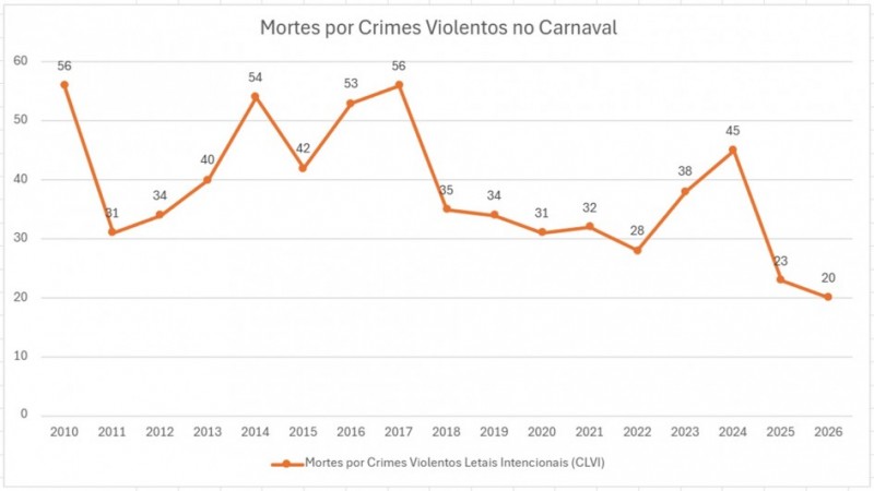 O mesmo ocorre em relação ao roubo de veículos, que registrou 13 ocorrência no Carnaval de 2026, o menor número de toda a série. Em relação a 2010, que teve 133 ocorrências de roubo de veículos, a queda é de 90%. O ano de 2017 também apresentou o pico neste tipo de ocorrência, com 257 registros. Para este caso, a queda em 2026 é ainda maior, chegando a 95%.
