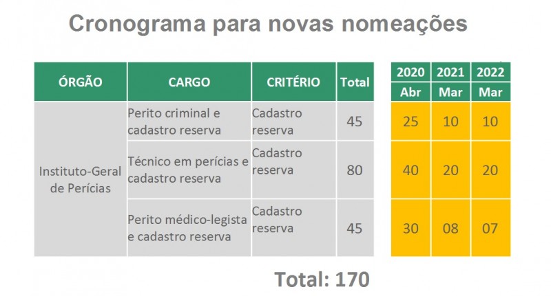 Conforme o governador Eduardo Leite e o vice-governador e secretário da Segurança Pública, Ranolfo Vieira Júnior, 170 vagas para perito criminal, técnico em perícias e perito médico-legista, bem como cadastro reserva, serão preenchidas ao longo de três anos – sendo 95 já no próximo mês. Outros 38 estão previstos para março de 2021 e mais 37 em março de 2022.